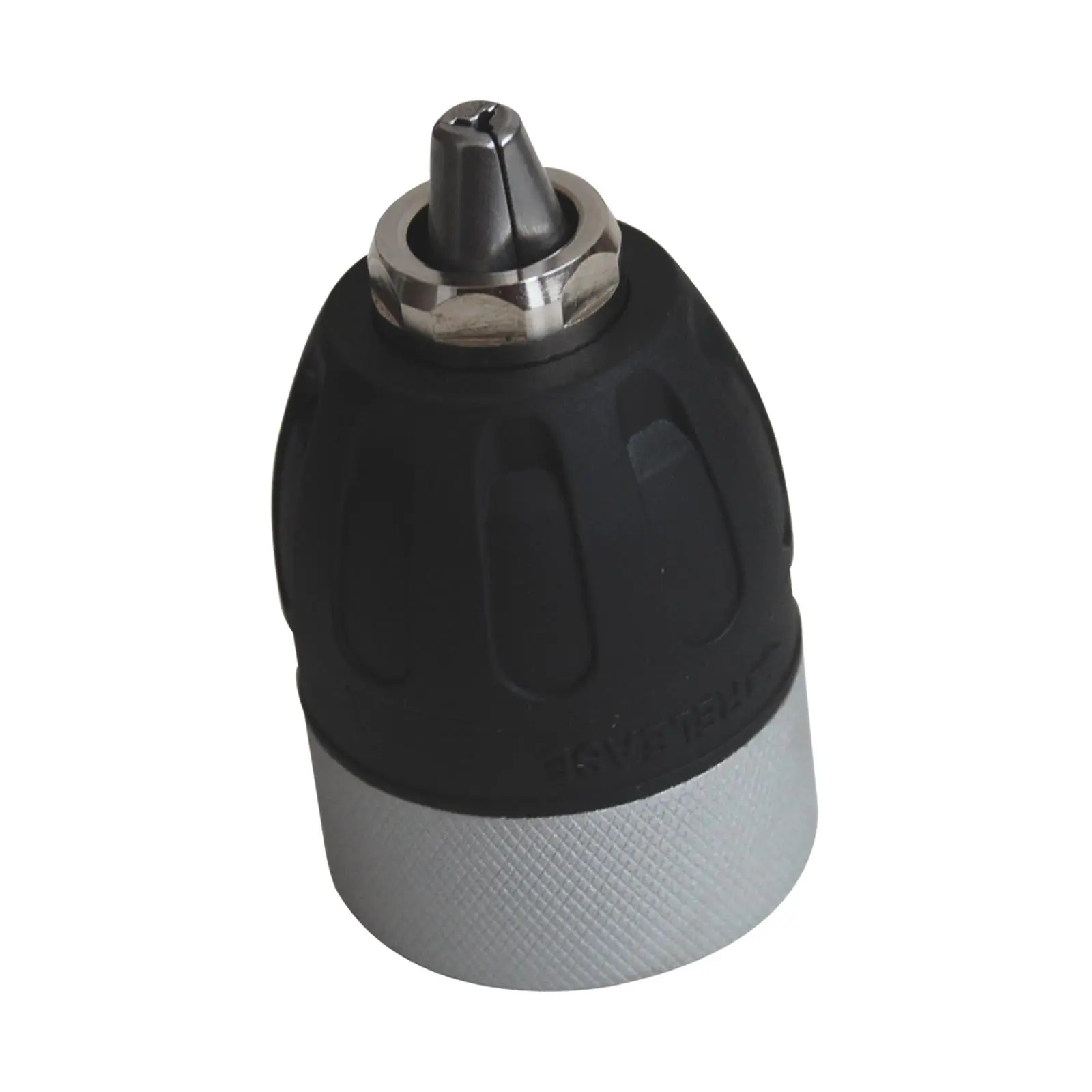 Rychloupínací sklíčidlo na vrtačku s CLICK-LOCK SYSTÉMEM, který umožňuje rychlou výměnuvrtáku bez použití kličky, zabraňuje jeho uvolnění a tlumí vibrace při vrtání. Celokovové sklíčidloz kalené oceli zaručuje dlouhou životnost a precizní přesnost vrtání s možností použití příklepu.Karbidové upínací fazety s možností vrtání s příklepem. přesnost 0,35,D-43mm L1-63mm L-75mm