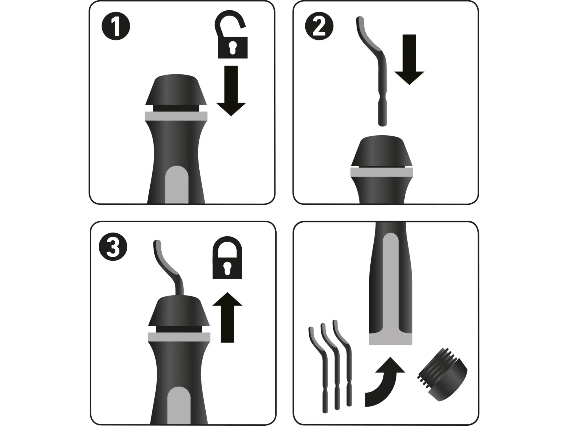 • čepelka o průměru dříku 3,2mm se pro práci do rukojeti zafixuje, náhradní čepele lze umístit dovnitř rukojeti, která tímto funguje i jako zásobník