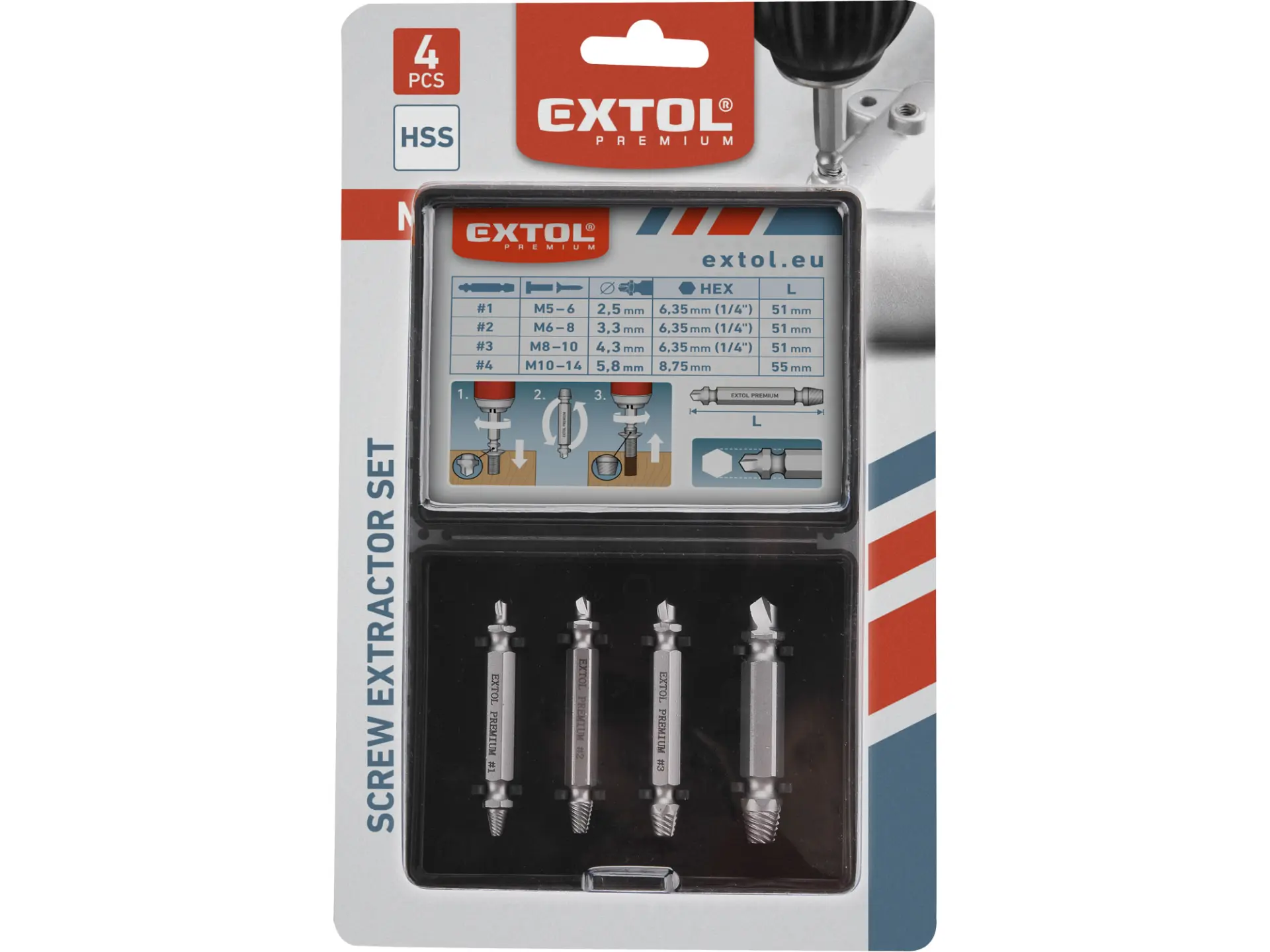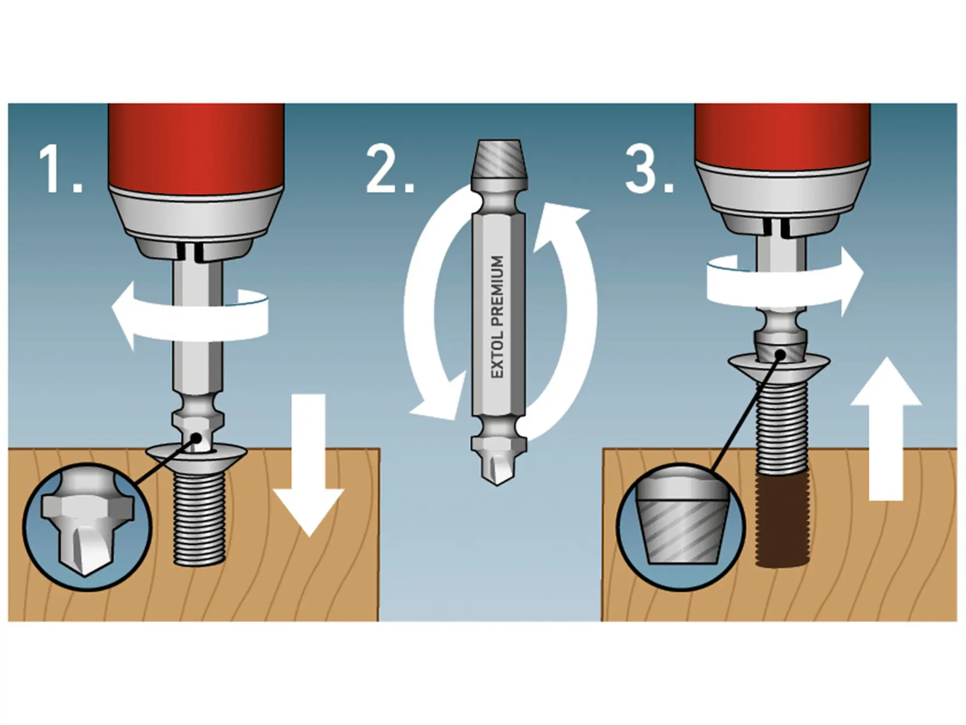 • unikátní tvar vytahováků, vrtáky pro předvrtání otvorů ve šroubech a vytahováky v jedné sadě
