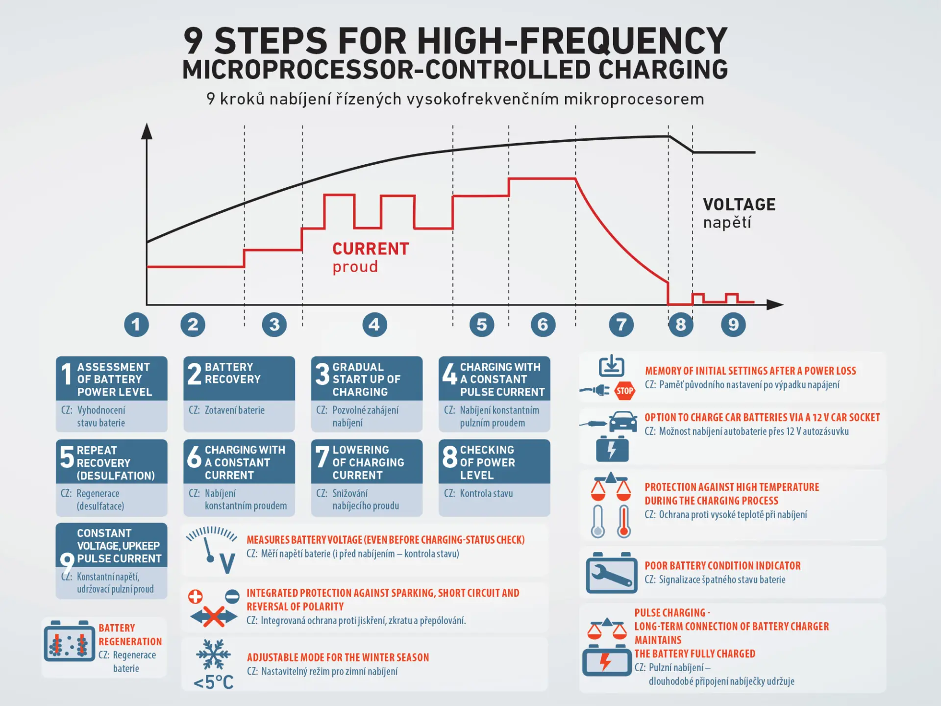 Nabíječka je určena pro nabíjení 12V nebo 6V olověných akumulátorů se zaplavenou elektrodou WET i Calcium, MF VRLA akumulátorů, AGM, i gelových a 12V LiFePO4 akumulátorů. Pro svou práci využívají automatický přepínací mód o vysoké frekvenci. Vestavěný mikroprocesor v naprogramovaných 9fázích procesu zajistí nabití baterií až do 100% jejich originální kapacity. Po zapnutí nabíječky a připojení na akumulátor uvidíte na displeji jeho napětí a můžete si zvolit jestli nabíjíte 12V baterii v autě, motocyklu, v zimě, LiFePO4 nebo 6V baterii. Pokud se při nabíjení detekuje částečně sulfátovaná baterie, zapne se automaticky funkci desulfatace baterie, která obnovuje její kapacitu. Nabíječka má ochranu proti přebíjení, přehřátí, zkratu, přepólování. Při výpadku napájení si zapamatuje nastavený typ nabíjení a po opětovném zapnutí ho nastaví. Nabíječka je velmi flexibilní ve způsobu připojení baterií a je vybavena 4různými koncovkami: klasické krokosvorky, očka, SAE konektor a 12V autozásuvka. 9 nabíjecích stupňů 1-vyhodnocení stavu baterie2-zotavení baterie3-pozvolné zahájení nabíjení4-nabíjení konstantním pulzním proudem5-regenerace(desulfatace)6-nabíjení konstantním proudem7-snižování nabíjecího proudu8-kontrola stavu9-konstantní napětí, udržovací pulzní proud