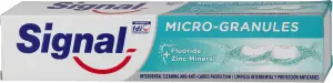 Zubní pasta Signal Micro-Granules obsahuje kombinaci jemných bílých a zelených granulí pro účinné odstranění plaku, dokonce i v mezizubních prostorech.