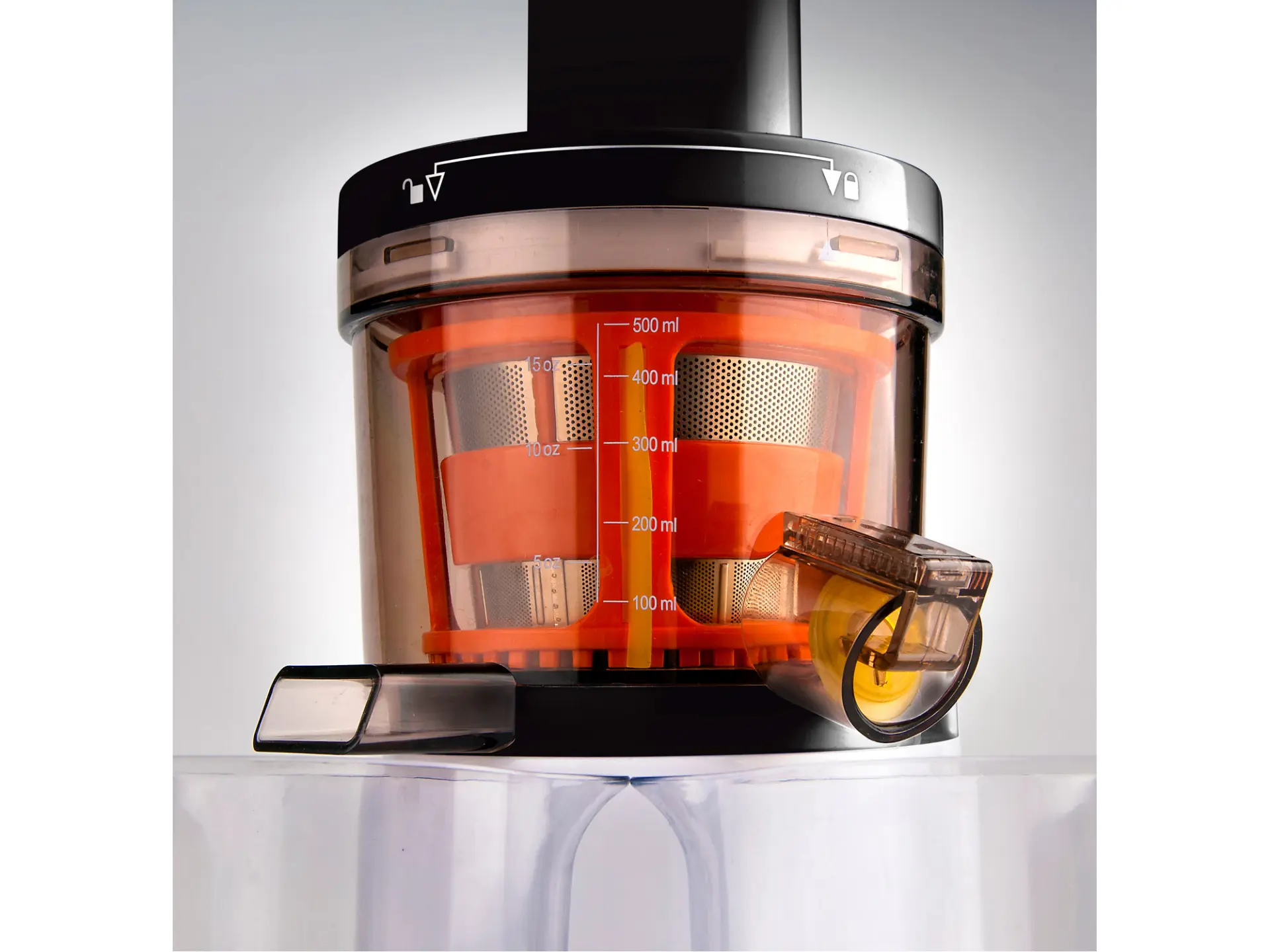 Tento nízkootáčkový odšťavňovač patří mezi nejnovější generaci přístrojů, jenž využívají technologii dvoufázového, pomalého odšťavňování. V první fázi je ovoce a zelenina nadrcena a ve druhé fázi je nadrcená hmota prolisována. Tímto způsobem je dosaženo maximální využitelnosti zpracovaných surovin. Při pomalém zvyšování tlaku nedochází ke zvyšování teploty a proto vitamíny a minerály zůstanou uchovány ve šťávě. Nedochází k míchání se vzduchem a tím k procesu oxidace. Výsledná chuť i barva je lepší.Oproti odstředivým odšťavňovačům, méně zahřívá lisovanou směs, a tím zabraňuje znehodnocování vitamínů a zachovává přirozenou chuť čerstvého ovoce a zeleniny. Tento způsob zpracování je vysoce účinný a současně maximálně šetrný. Přístroj se dá snadno rozebrat a velmi jednoduše a rychle se čistí. Většinou stačí propláchnout pod tekoucí vodou, případně síto dočistit kartáčkem, který je součástí příslušenství. Nezanedbatelnou předností tohoto odšťavňovače je jeho velikost. Je nenáročný na prostor a místo si najde i v té nejmenší kuchyni. Příslušenství - pěchovadlo- nádoba na šťávu- nádoba na odpad- kartáček na čištění