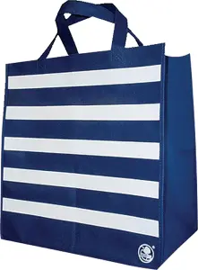 Látková taška nákupní, ideální pro velké rodinné nákupy. modro bílý pruhovaný vzor. Rozměr 34 × 36 × 22 cm.