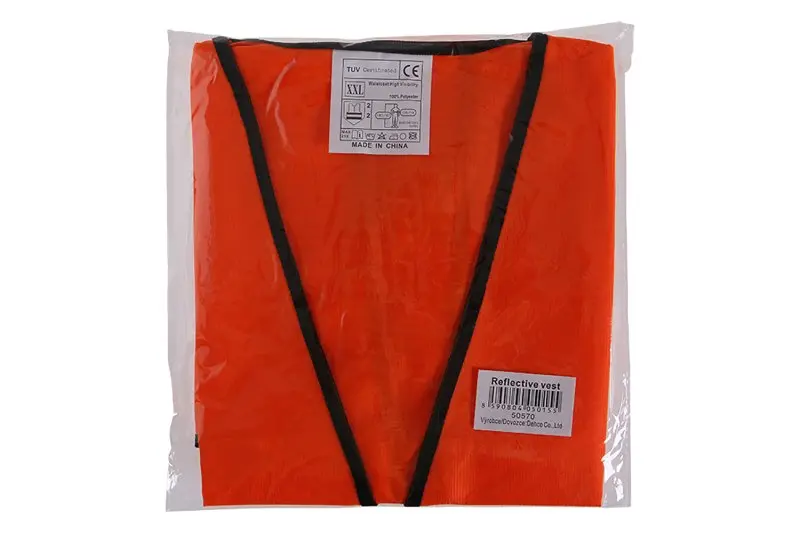 Oranžová polyesterová výstažná vesta, 2 horizontální reflexní pruhy, zapínání na suchý zip, velikost UNI , CE EN 471.