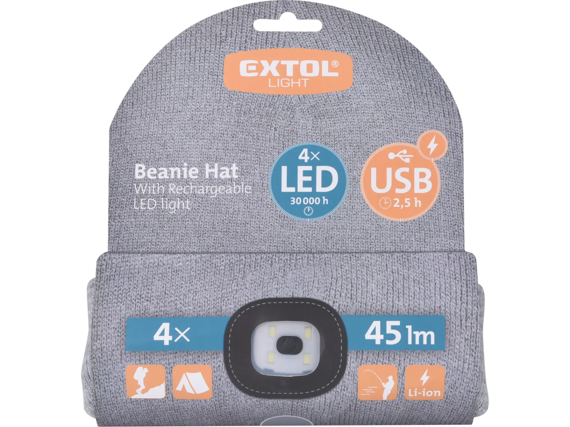 čepice s čelovkou 4x45lm, USB nabíjení, šedá, univerzální velikost, 73% acryl a 27% polyester