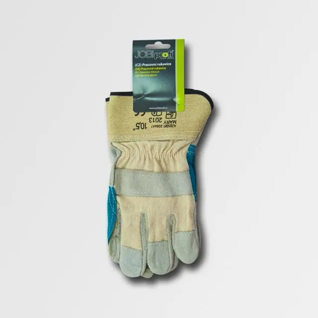 Zdvojená dlaň z šedé a zelené hovězí štípenky, hřbet a tuhá manžeta z bílé bavlněné tkaniny, podšívka ve dlani.