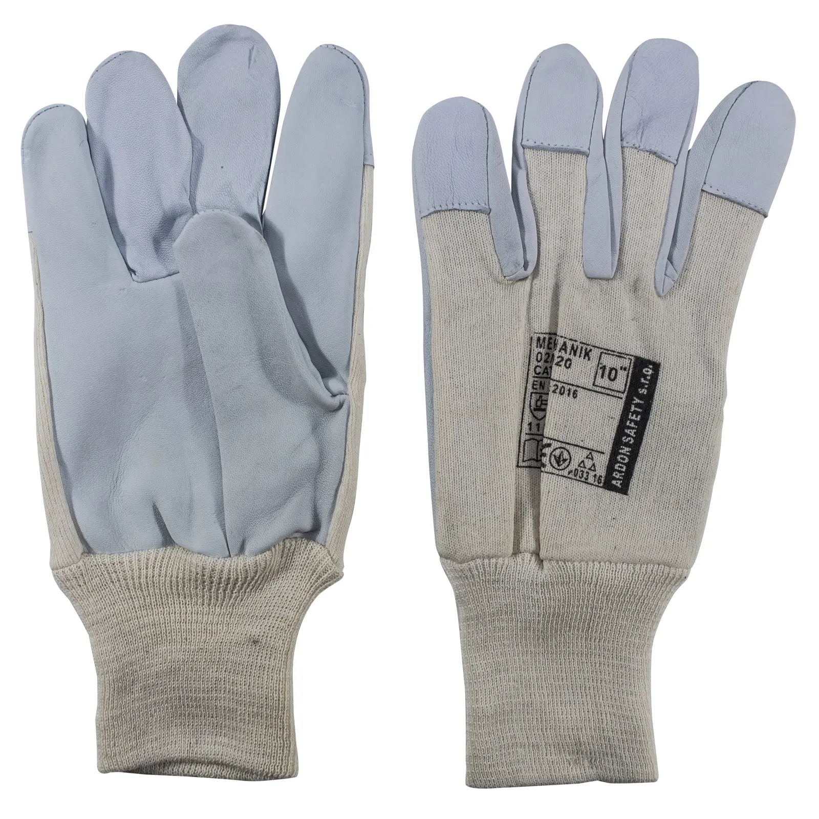 Kombinované rukavice "mechanik", dlaň z jemně činěné tříděné lícové jehnětiny, hřbet z bavlněného bílého úpletu s pružnou pletenou manžetou