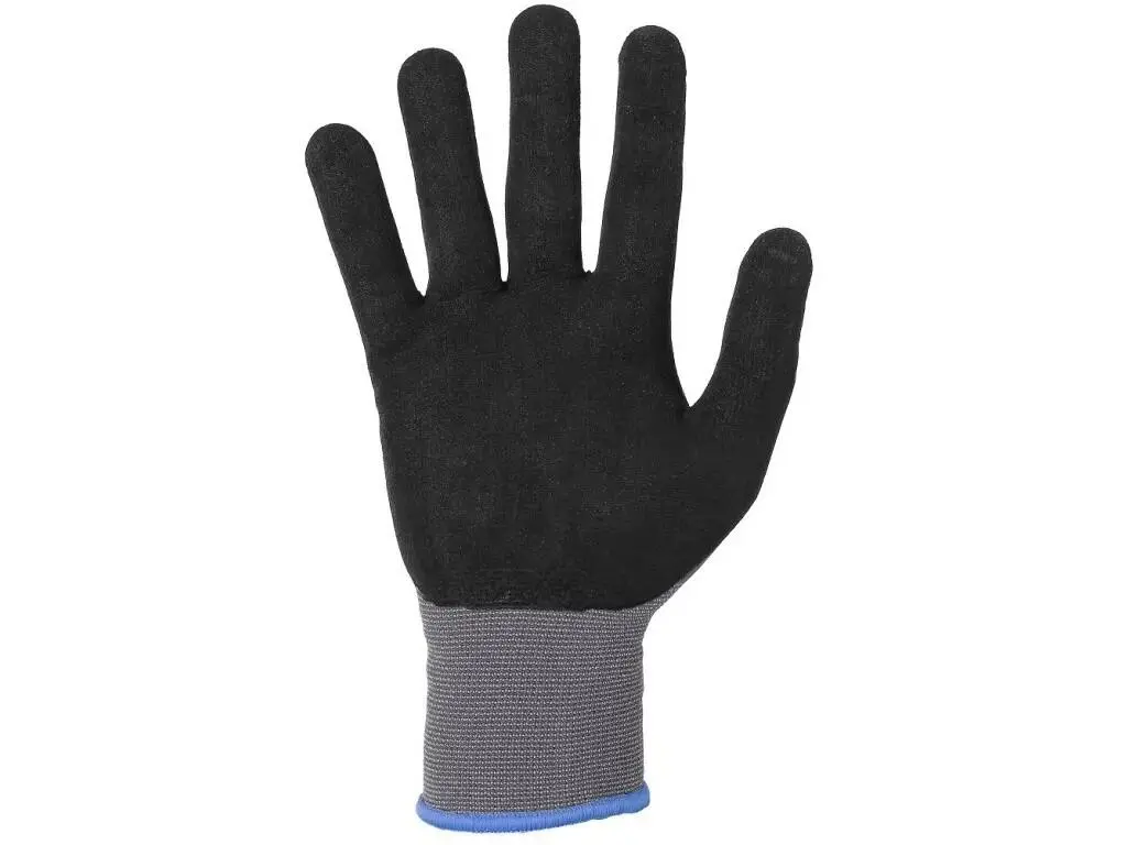 Bezešvé rukavice z pružného nylonového úpletu s dlaněmi a prsty povrstvenými směsí pěnového nitrilu a polyuretanu na vodní bázi s pískovou úpravou pro lepší úchop, ochrana proti kontaktnímu teplu do 100 °C, pružná manžeta. Baleny s blistrem. Doporučené aplikace: automobilový průmysl, logistika, skladování, práce s horkými předměty do 100 °C, hobby, práce s kluzkými předměty, zahrada, stavebnictví, komunální služby, montáž a balení malých součástek.