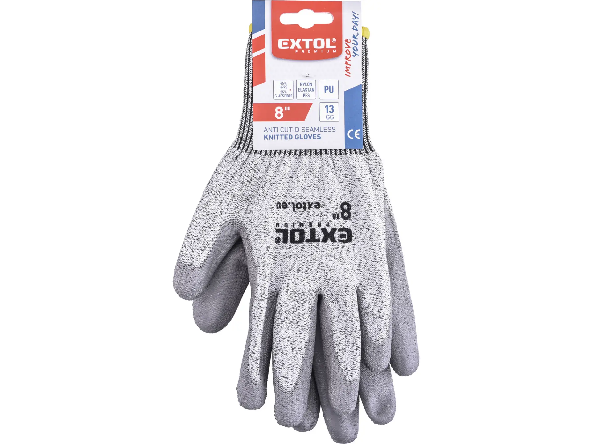 • úplet rukavic s hustotou 13GG (gauge) je tvořen ze 45% HPPE (protiřezným vláknem), z 25% skelným vláknem a dále směsí materiálů SPANDEX, nylon, polyester