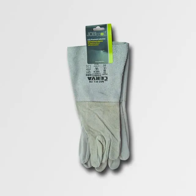 Celokožené rukavice z šedé hovězí štípenky, tuhá manžeta 15cm, bez podšívky – certifikát pro svářečské práce.
