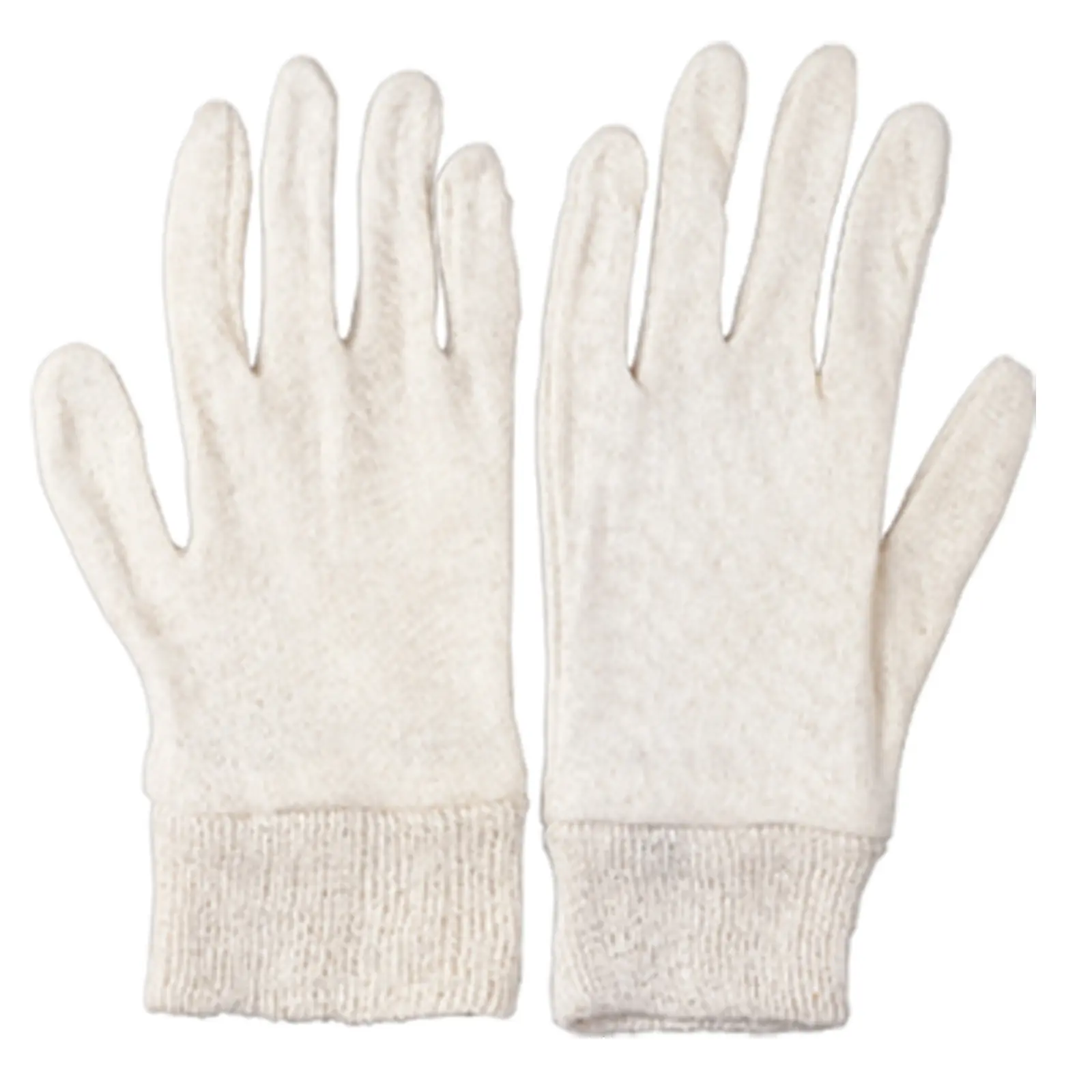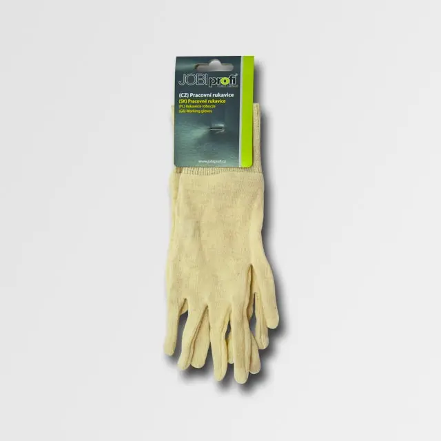 Pětiprsté rukavice šité z jemného režného bavlněného úpletu s pružným nápletem na zápěstí. velikost: univerzální