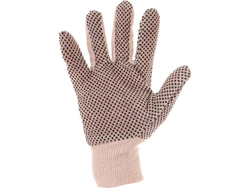 Textilní rukavice šité z bavlněného plátna, dlaň a prsty pokryty PVC terčíky, pružná manžeta. Doporučené aplikace: logistika, skladování, hobby, lehká montáž, zemědělství, zahrada.