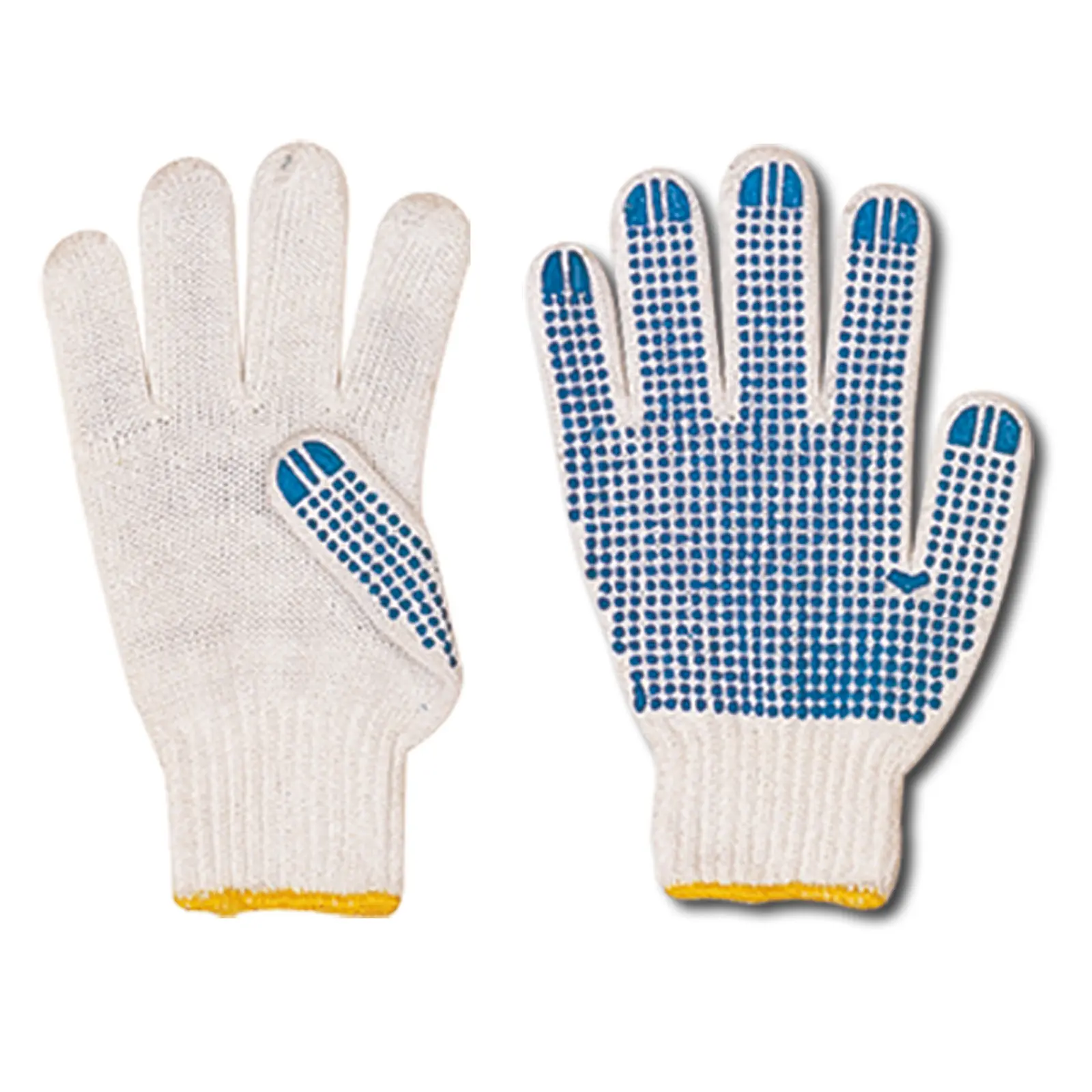 Pětiprsté rukavice Plover, pletené, polyesterové rukavice s modrými protiskluzovými terčíky PVC na dlani a prstech. Pružný náplet na zápěstí.Vhodné všeobecně pro manipulaci se suchými, neagresivními materiály.
