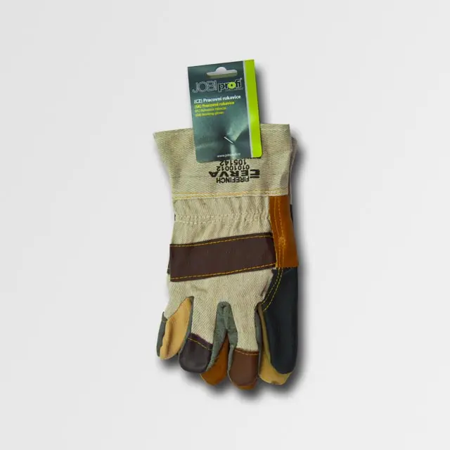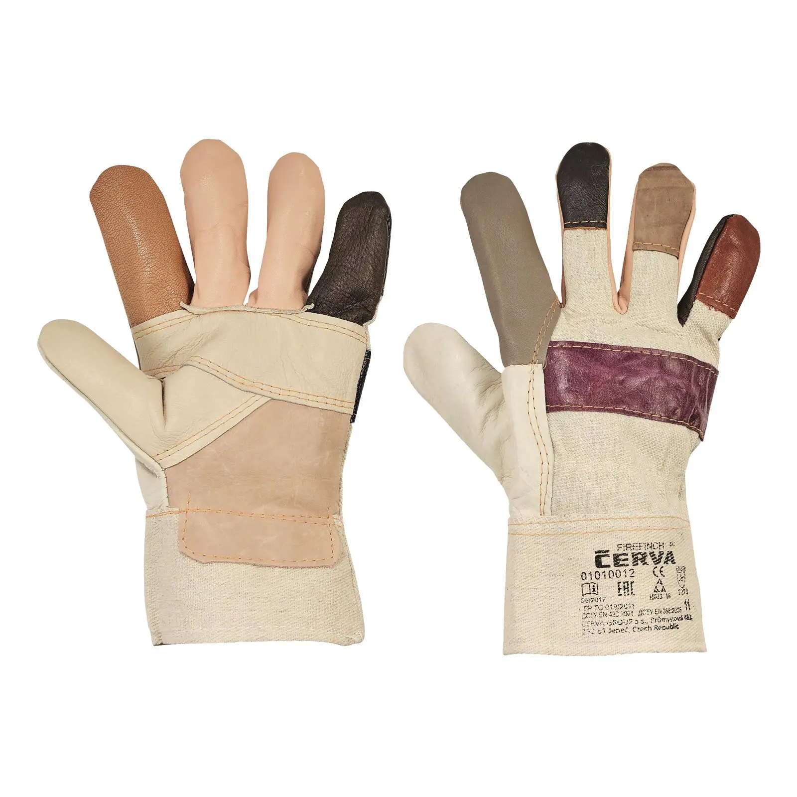 Zimní kombinované rukavice, dlaň z různobarevné lícové nábytkové hověziny, hřbet a manžeta z bílé bavlněné tkaniny, zateplená podšívka.