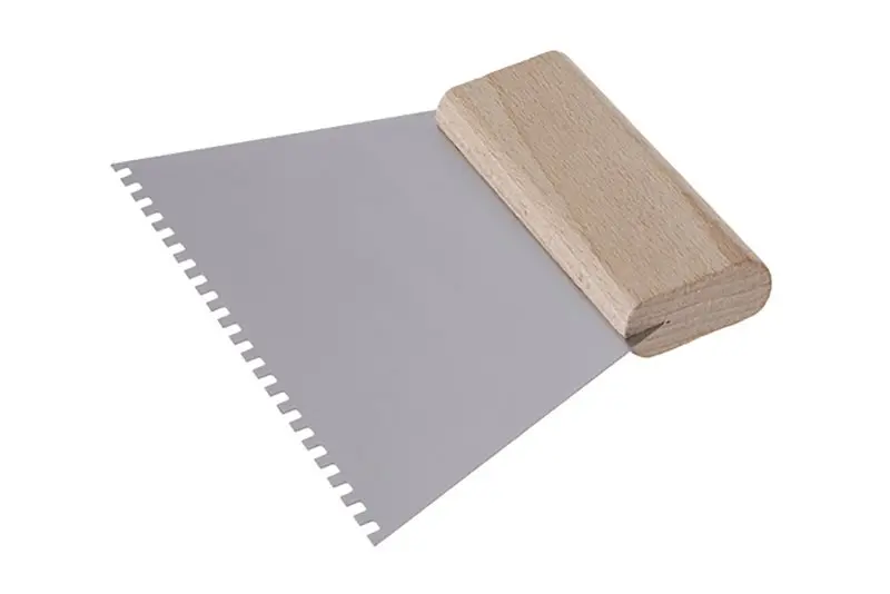 Stěrka ocelová 180 mm zub e4 s dřevenou rukojetí. Stěrka pro malířské, zednické a podlahářské práce. Slouží k aplikaci samonivelačních hmot, lepidel, malty atd.