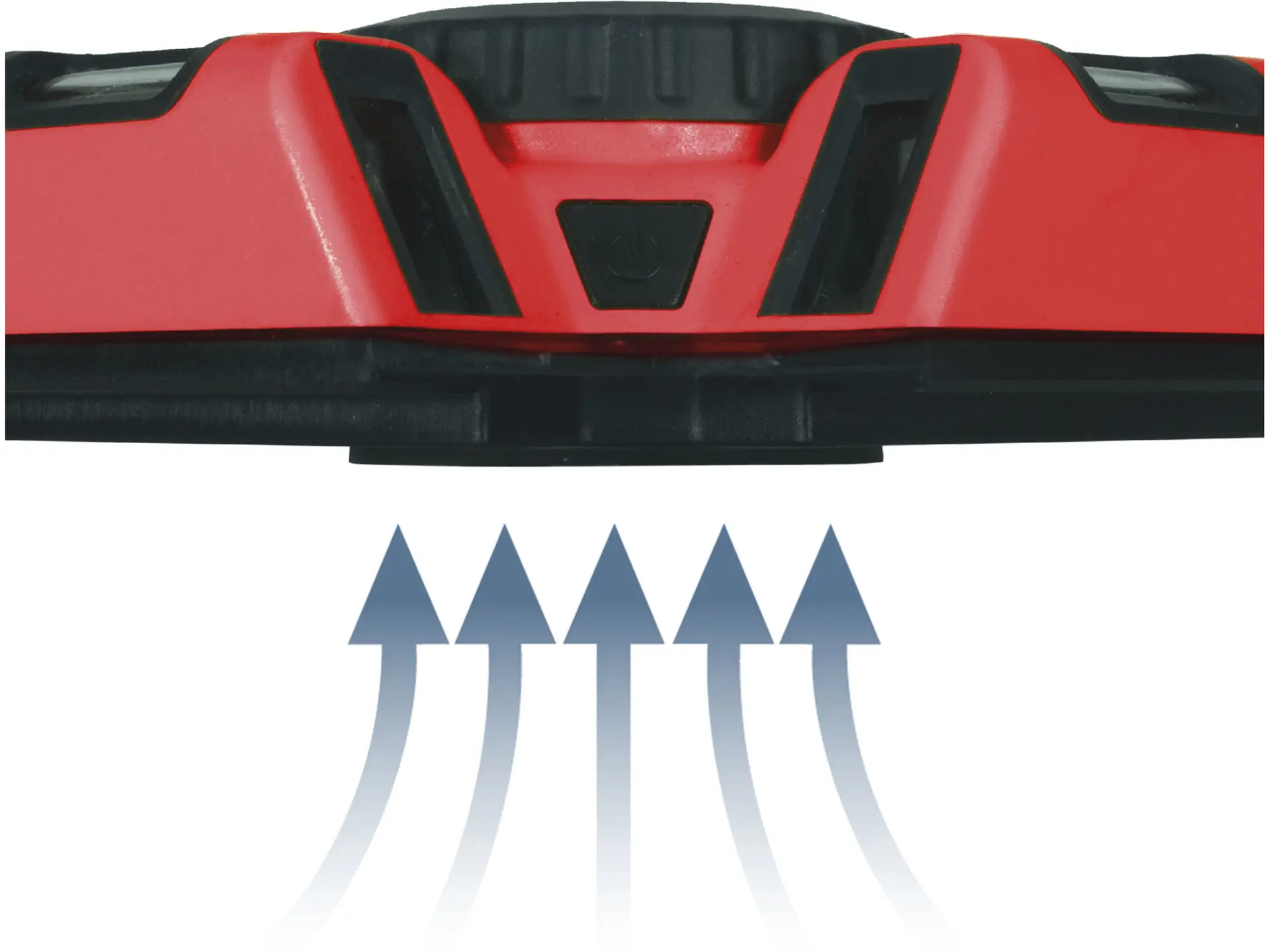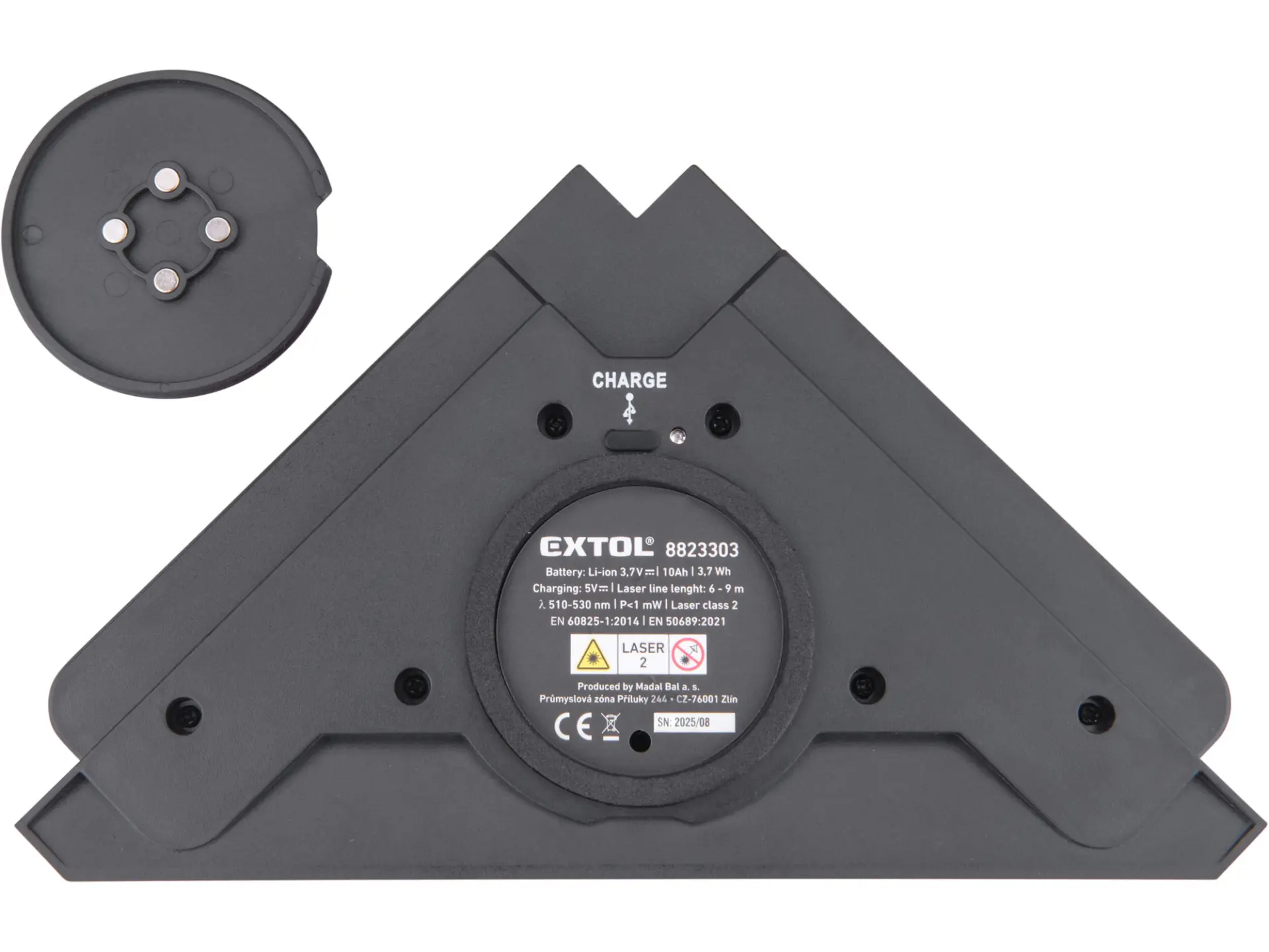 • laserový úhelník je vybaven elektrickým přísavným modulem se sacím výkonem cca 2l/min; plně nabitý přístroj v pracovním módu (s oběma zapnutými laserovými liniemi), se tak dokáže na neporézních materiálech udržet po dobu až 3hodin; bez zapnutého přísavného modulu dokáže plně nabitý přístroj (s oběma zapnutými liniemi) pracovat po dobu max. 7hodin