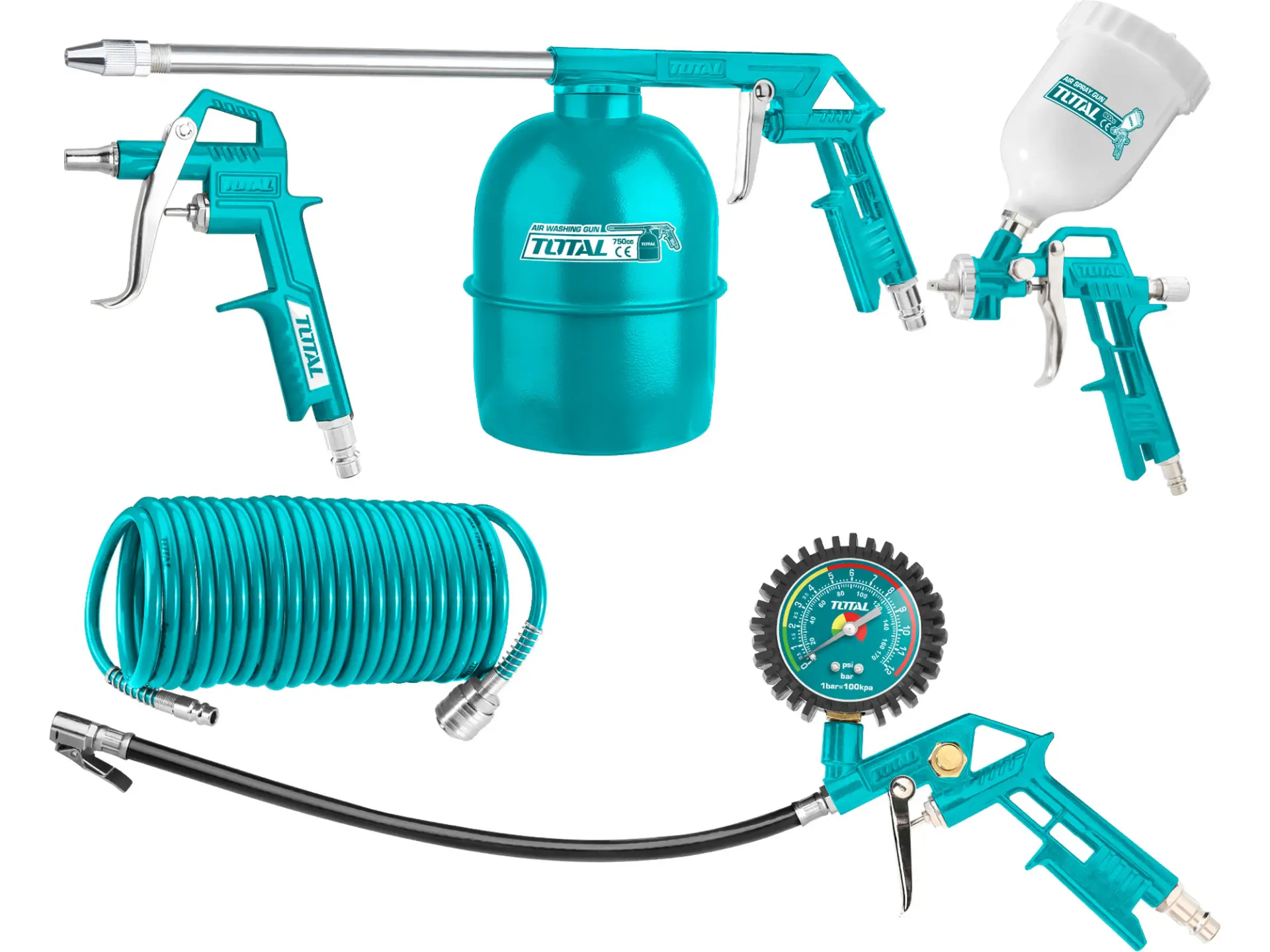 5dílná sada pneumatického nářadí je určena k běžnému použití v prostředí garáží, domácích dílen, chalup apod. a je ideálním příslušenstvím ke každému kompresoru. Skládá se z propojovací hadice na stlačený vzduch, mycí pistole, stříkací pistole, ofukovací pistole a pistole pro huštění pneumatik. Připojení kteréhokoli z nářadí s kompresorem se provádí velmi jednoduše za pomocí tlakové hadice o délce 5 metrů. Připojení je prováděno pomocí rychlospojek na koncích hadice.