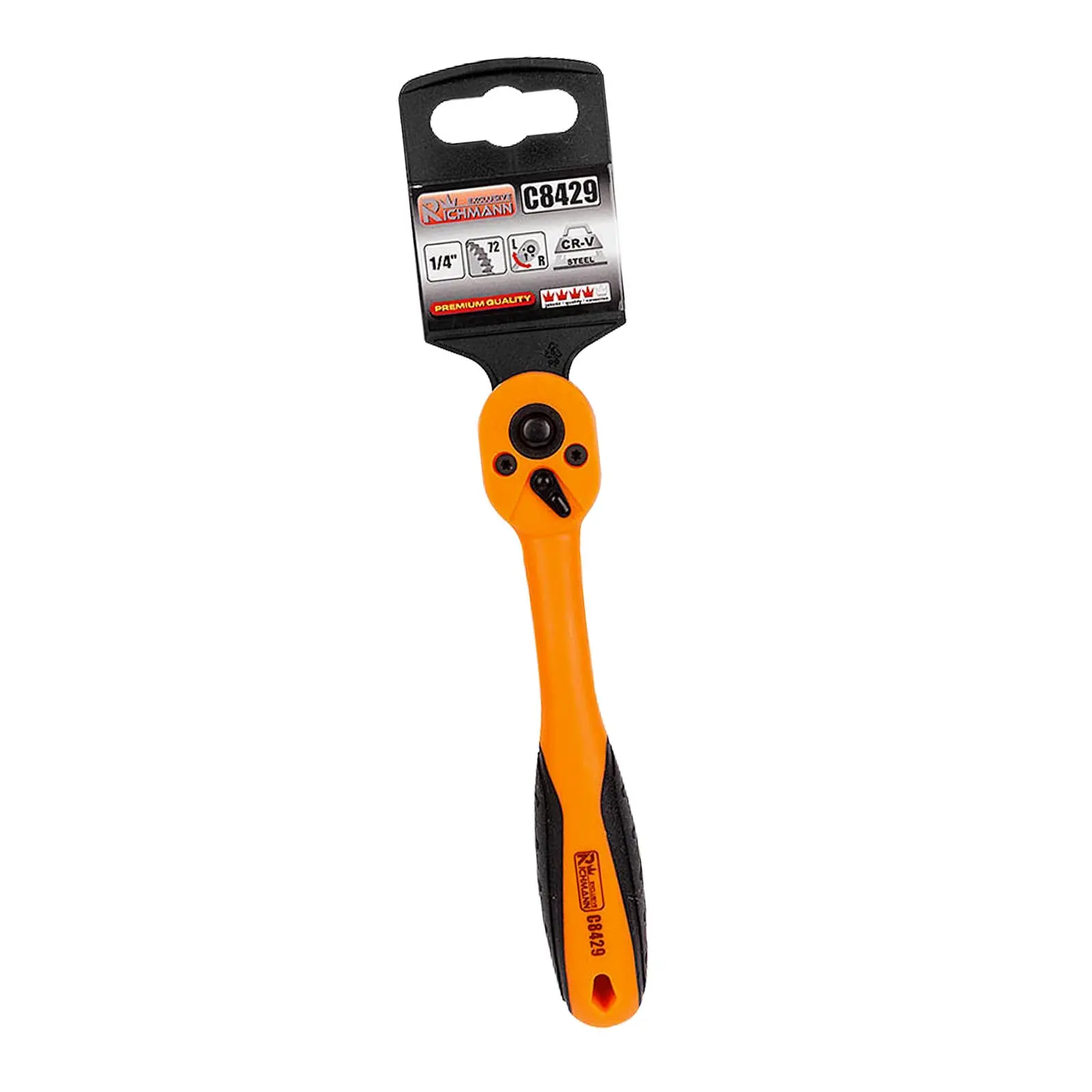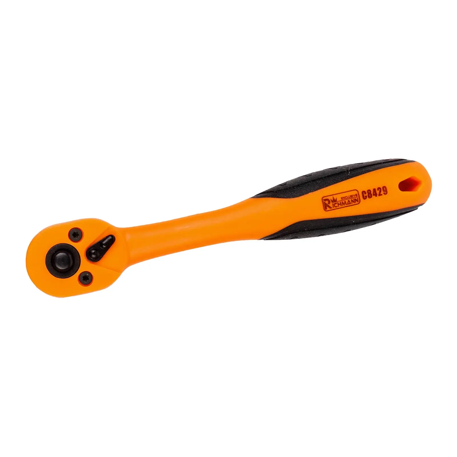 Ráčna vyhnutá s antikorozní úpravou, páčka pro přepínání směru utahování, tlačítko pro výměnu hlavice.
