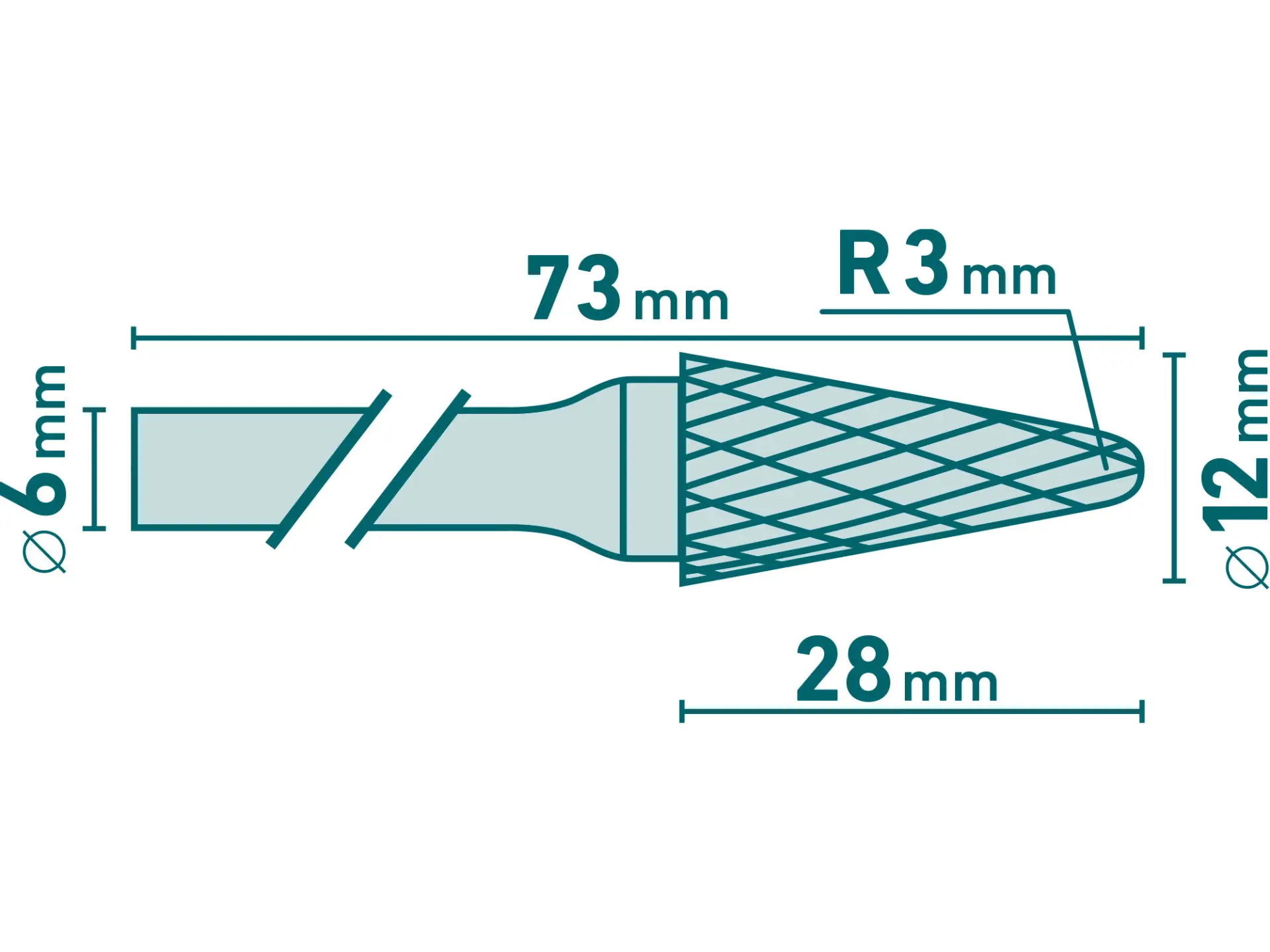 průměr frézy 12mm, délka ostří 28mm, průměr stopky 6mm, celková délka 73mm, materiál wolfram karbid, tvrdost 89-91HRA