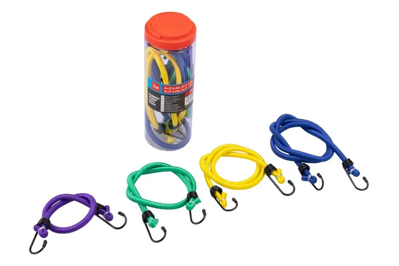 Sada klasických elastických popruhů s ocelovými háky. 2 x délka 0.4, 0.6, 0.8, 1 m. Jsou určené pro fixaci předmětů. Popruh je tvořen z gumových vláken potažených opletem ze syntetické elastické tkaniny.